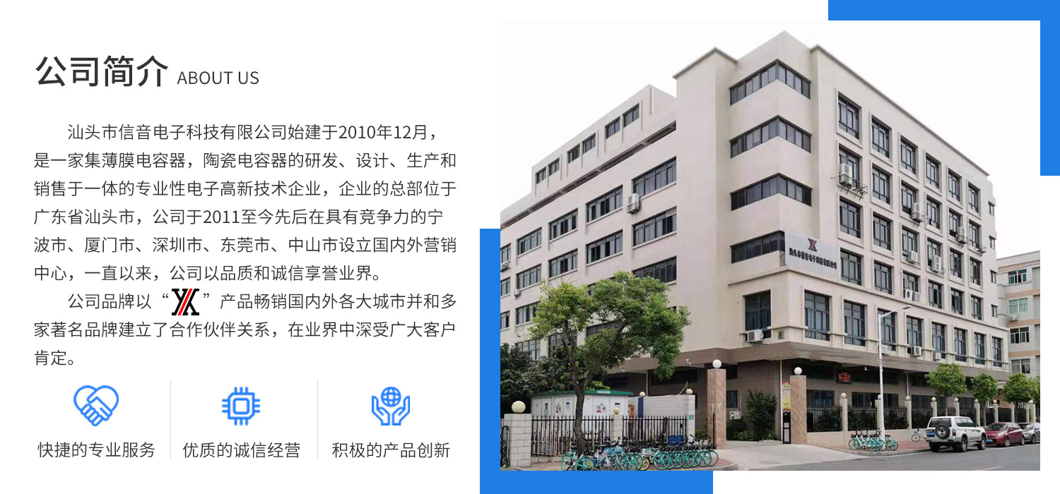 汕頭市信音電子科技有限公司網(wǎng)站正式上線(xiàn)! 汕頭市信音電子科技有限公司始建于2010年12月,是一家集薄膜電容器,陶瓷電容器的研發(fā)、設(shè)計(jì)、生產(chǎn)和銷(xiāo)售于一體的專(zhuān)業(yè)性電子高新技術(shù)企業(yè)。